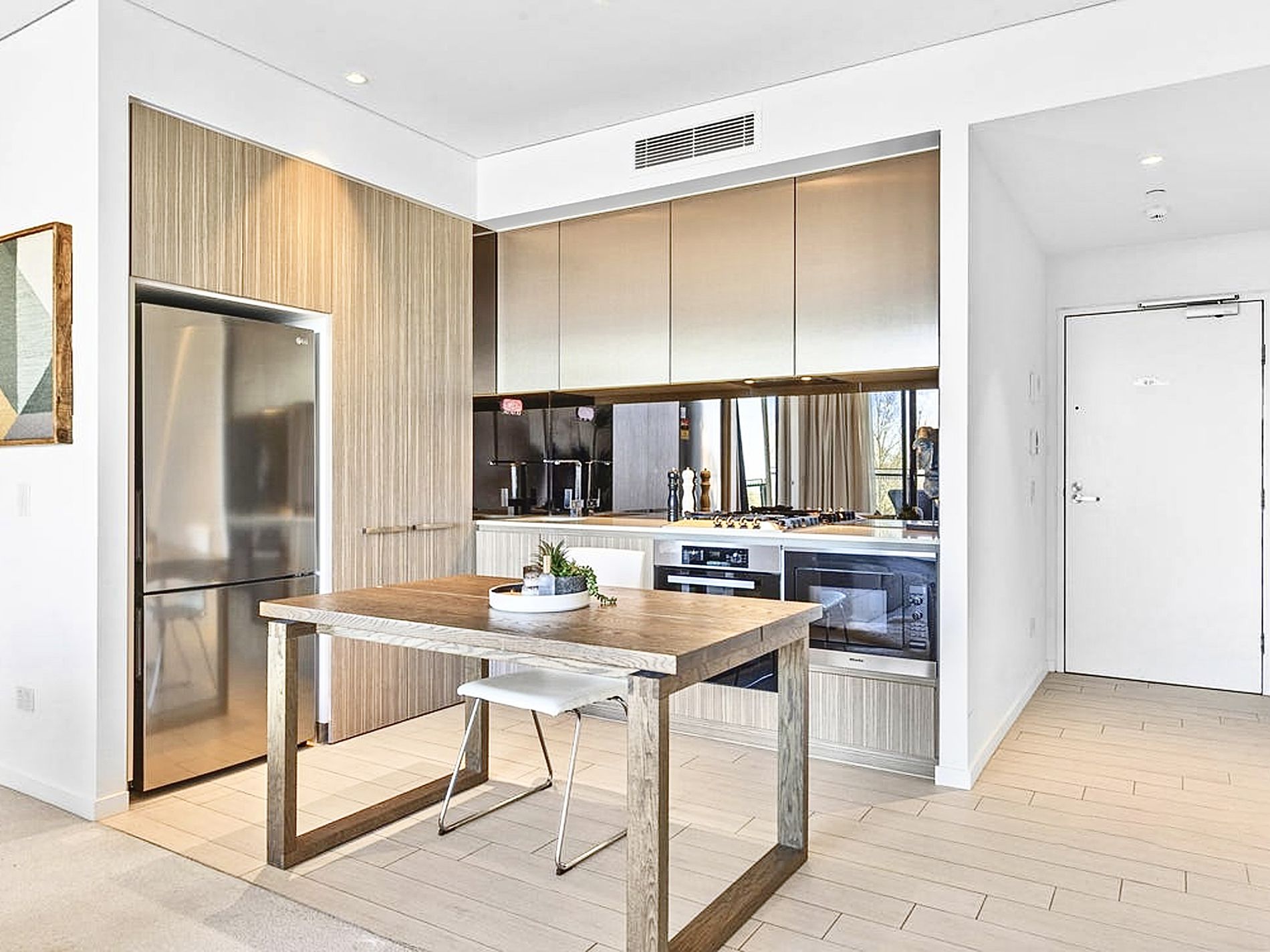 -European appliance Dishwasher, stone benchtop and mirror splash-back